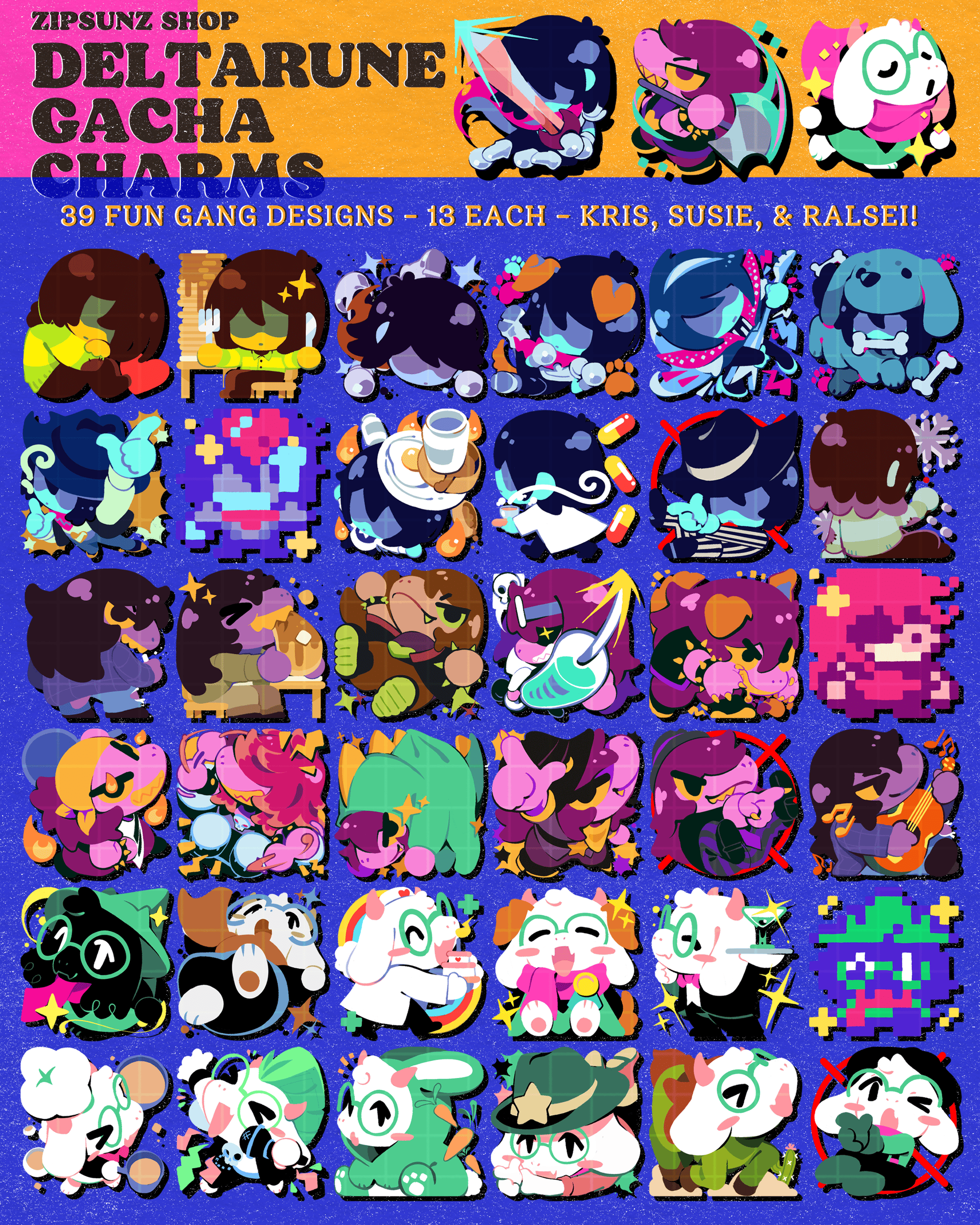 The current selection consists of 13 unique charms of Kris, Susie, and Ralsei.