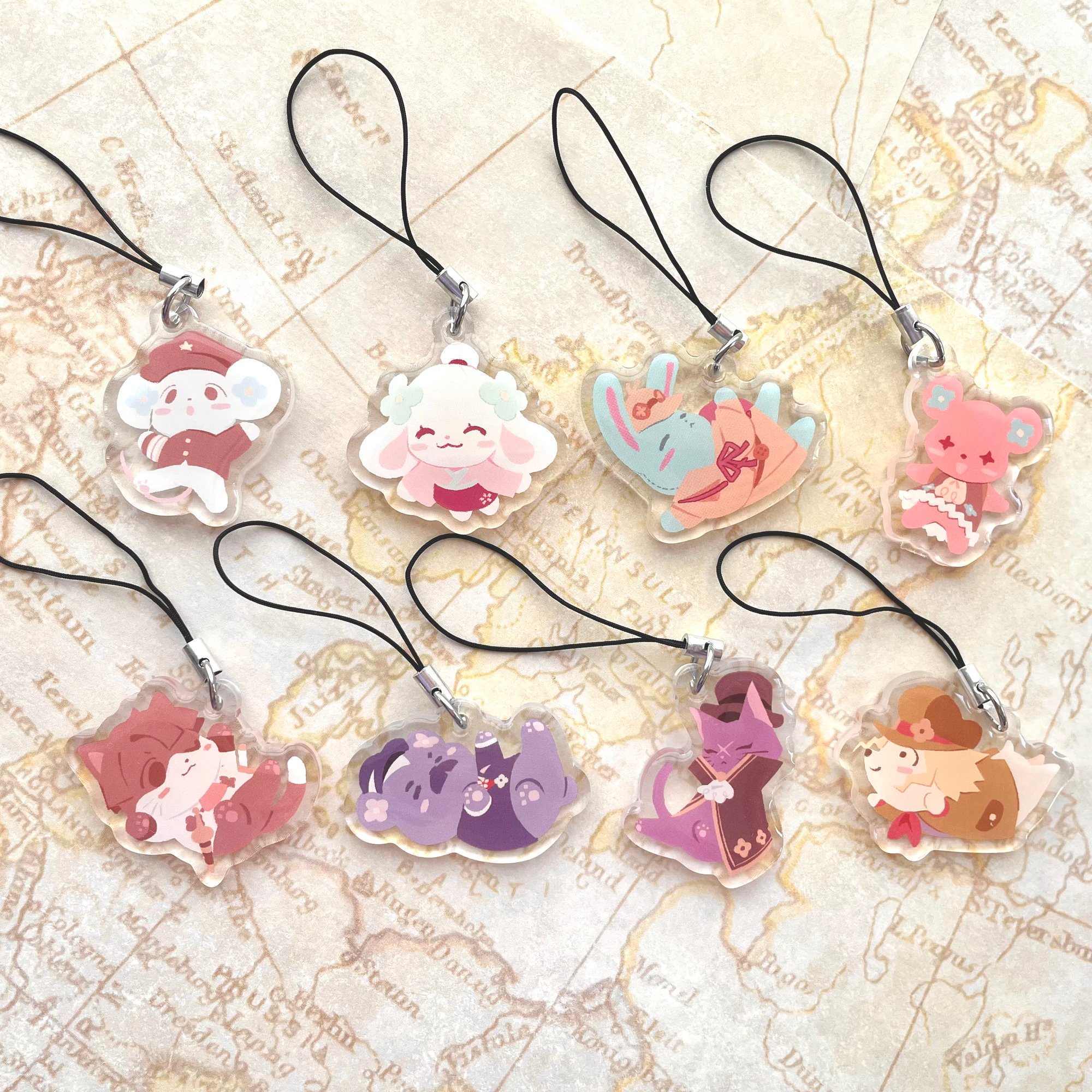 The single-sided epoxy charms are 1.5 inches (~3.8cm) with a black phone strap.